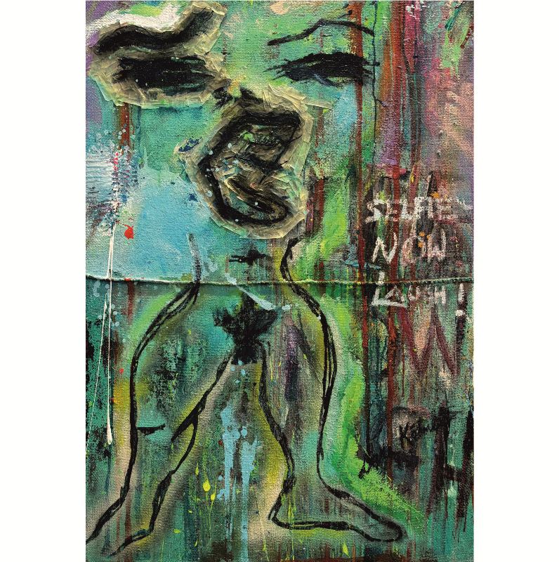 Beschreibung: Aus der Serie Selfie Acryl, Klebeband, Kohle auf Kaffeesack / Platte Signiert und datiert